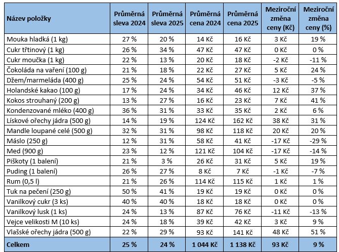 Polovina z dvaceti sledovaných položek meziročně zdražila a nejvíce je to patrné u ořechů. Půl kila vlašských ořechů vyjde v průměru na 141 korun, což je o polovinu více než loni. Lískové ořechy jsou dražší o třetinu a mandle o pětinu. O sedm korun více stojí 200 gramů strouhaného kokosu (+ 41 %), 100 gramů holandského kakao oproti loňsku zdražilo o 12 korun (+ 37 %). Příplatek v řádu nižších jednotek korun čeká spotřebitele při nákupu kilogramu hladké mouky, tabulky čokolády na vaření, kondenzovaného mléka, balení piškotů či deseti vajec velikosti M.