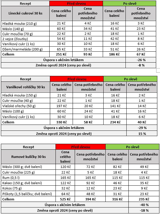 Ingredience na přípravu lineckého cukroví se letos dají pořídit za méně než 200 korun. Díky akčním letákům za ně mohou spotřebitelé ušetřit až 26 % oproti plné ceně. Balík surovin na přípravu vanilkových rohlíčků lze pořídit až s třetinovou slevou, přesto oproti loňsku zdražil zhruba o 15 %. Může za to zejména výrazné zdražení vlašských ořechů. Příprava rumových kuliček může být díky akčním cenám levnější až o 40 %. Domácnostem se tedy před nákupem surovin na pečení opravdu vyplatí prostudovat akční letáky.